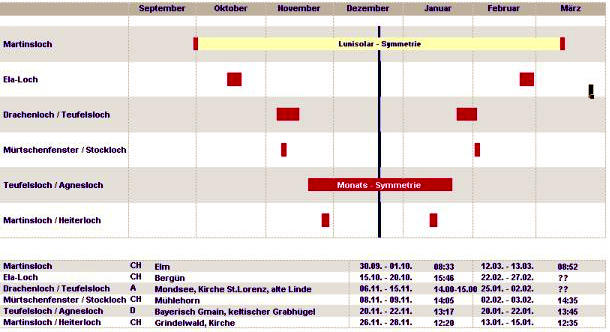 und Bayerisch Gmain / Großgmain aufgeführt. Darin wird auch der früheste Zeitpunkt eines Sonnendurchgangs (30. September = Martinsloch/Elm) und der späteste Zeitpunkt (13 März =