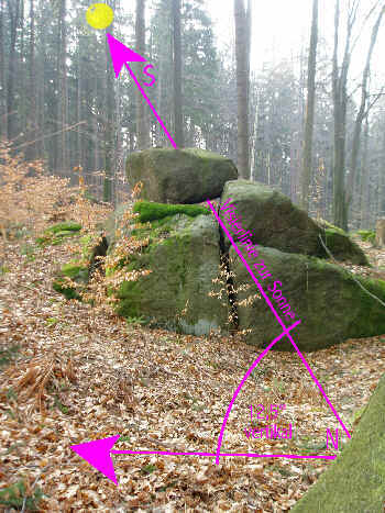 taufte diese Vertiefungen daher "Himmelsaugen". Die Visurlinie in Nord-Süd-Richtung durch das Sichtloch unter dem Felsturm 12,5° zur Sonne beginnt genau an der