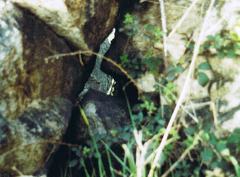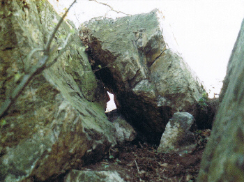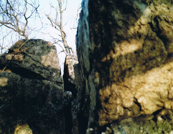 Eine Kluft, die den Felsen in ganzer Länge teilt, scheint natürlichen Ursprungs zu sein. Der enge