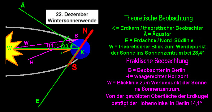 theoretischen Beobachter an, der vom Mittelpunkt der Erde zum Mittelpunkt der Sonne blickt, so liegt der Wintersonnenwendepunkt bei annähernd 23,4°.