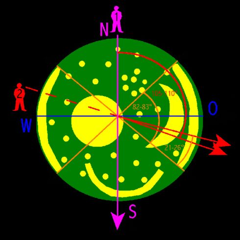 Horizont mit den auf der Himmelsscheibe dargestellten 82-83° identisch ist. Die Beobachtungslinie von Nord nach Süd (lila / Beobachter 1) ist an den von ihnen beschriebenen