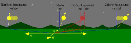 Zwischen der Beobachtungslinie in Nord-Süd-Richtung und der zweiten Beobachtungslinie (rot / Beobachter 2) besteht ein Winkel von 105-110°.
