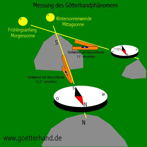 Die Differenz von 2° zu den von uns ermittelten Winkel ist möglicherweise der langen Zeit geschuldet, die seit der Nutzung der Götterhandphänomene vergangen ist