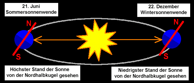 geneigt ist, entsteht der Eindruck, dass sich die Sonne zwischen zwei Wendepunkten am Himmel auf und ab bewegt, obwohl sie in Wirklichkeit "fest" an ihrem Platz stehen bleibt.