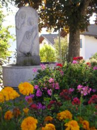 in der Meranser Kirche. Schon am Eingang zum Friedhof präsentiert sich ein Brunnen – wiederum mit einem großen Steinrelief von den Drei Bethen
