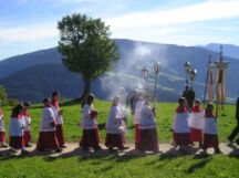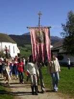 drei Jungfrauen auf einer Prozessionsfahne, auf der die Drei Bethen dargestellt sind, vorangetragen. Diese Ehre gebührt den jungen Mädchen Meransens in der „vermeintlichen“ Rolle der 3